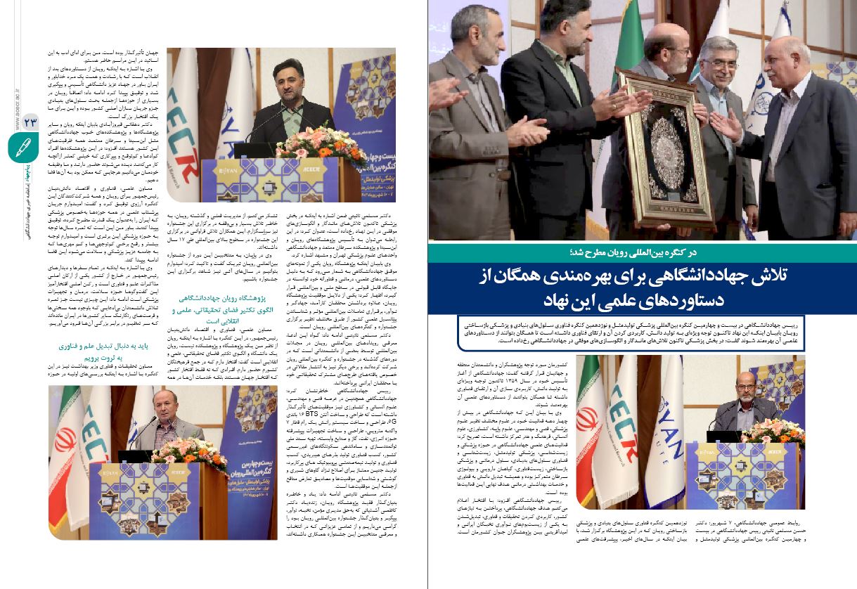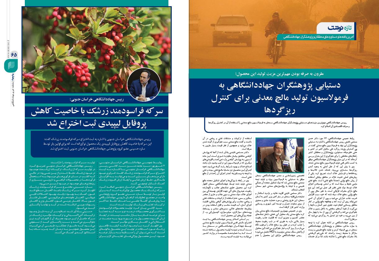 آمادگی جهاددانشگاهی برای همکاری با وزارت فرهنگ و ارشاد اسلامی؛ ابلاغ اساسنامه «جایزه زندهیاد دکتر کاظمی آشتیانی» توسط رییس جمهور؛ افتتاح مرکز طب پیشگیری و ارتقای سلامت جهاددانشگاهی؛ دستیابی پژوهشگران این نهاد به فرمولاسیون تولید مالچ معدنی برای کنترل ریزگردها و واگذاری ماموریتهای جدید به این نهاد در برنامه هفتم توسعهبخشی از مهمترین مطالب این شماره ماهنامه «پیام جهاد» است.