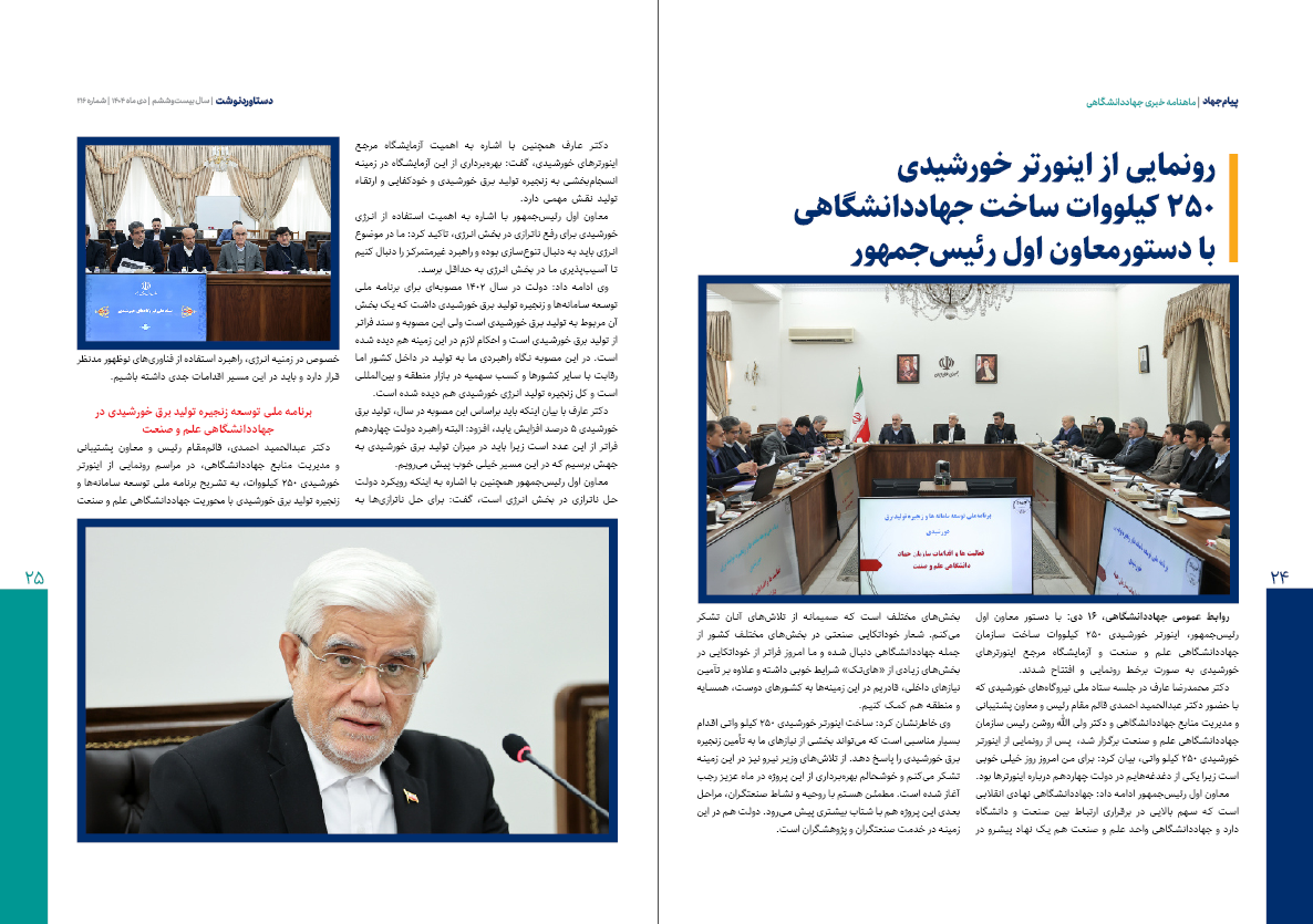 به گزارش روابط عمومی جهاددانشگاهی، رونمایی از اینورتر خورشیدی ۲۵۰ کیلووات ساخت جهاددانشگاهی با دستورمعاون اول رئیس جمهور؛ هوش مصنوعی و صنایع فرهنگی؛ پیشتازی شرکت‌های خلاق جهاددانشگاهی؛ ایجاد چهارمین پارک علم و فناوری جهاددانشگاهی با محوریت فناوری‌های نوین و هوش مصنوعی در حوزه سلامت؛ صدور موافقت اصولی راه‌اندازی مرکز آموزشی تخصصی محیط زیست؛ طرح ابتکاری جهاددانشگاهی برای اعطای تسهیلات به دانشجویان تحصیلات تکمیلی از جمله مهم‌ترین مطالب منتشر شده در این شماره ماهنامه «پیام جهاد» است.