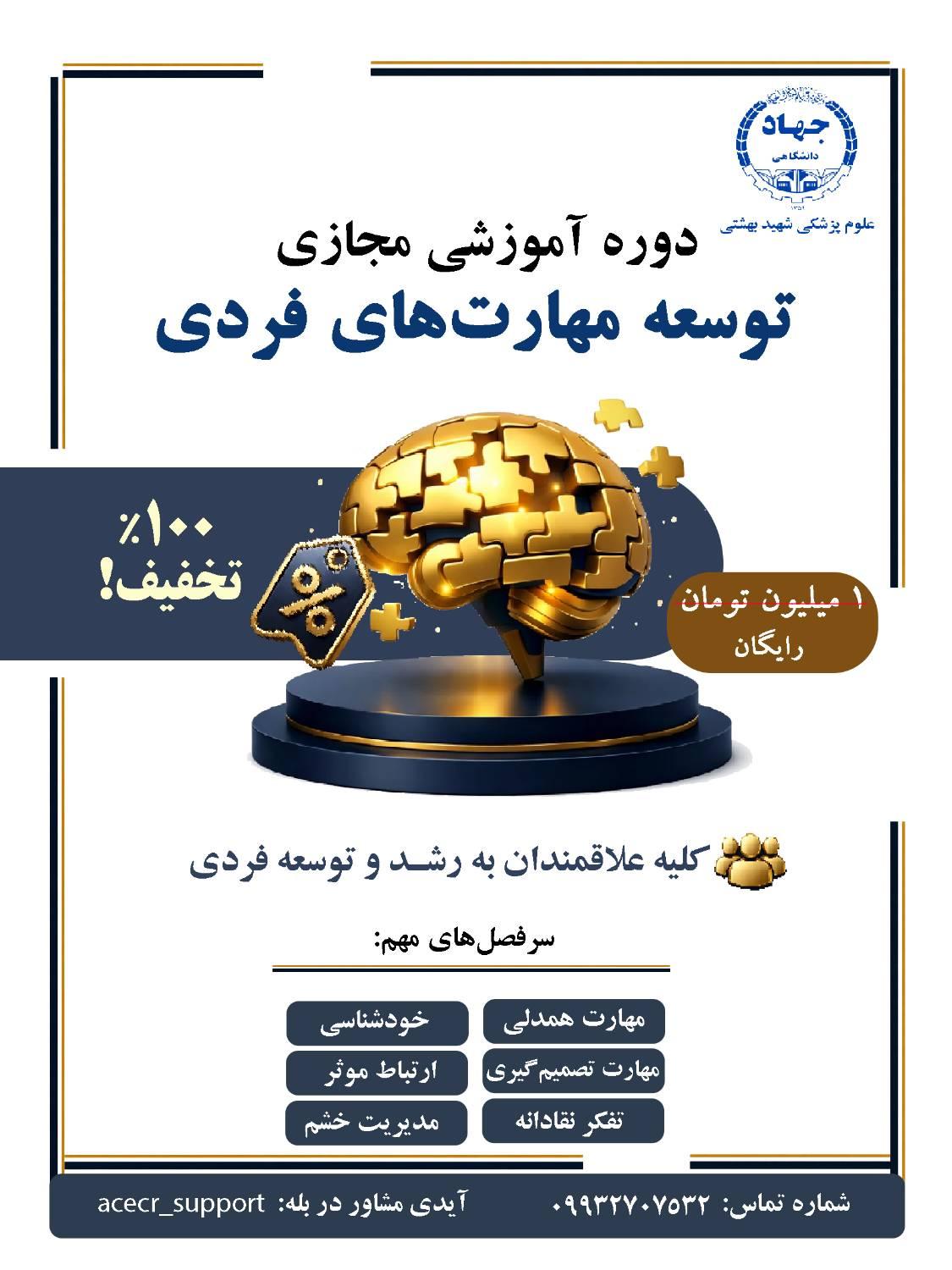 جهاددانشگاهی علوم پزشکی شهیدبهشتی وظیفه‌ی خود می‌داند قدمی کوچک برای همراهی با مردم کشور ایران بردارد. به همین دلیل دوره‌ی آموزشی مجازی «توسعه مهارت‌های فردی» را که ارزش آن یک میلیون تومان است، به‌طور رایگان برگزار می‌کند، تا فرصتی برای یادگیری، امید و پیشرفت فراهم شود.